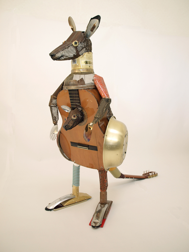 「弦のないフォークギターを見ていたら、穴があいてくびれていたので“カンガルーの胴体みたい”と思い、カンガルーを作りました。他にもヤカンを立ててみたら、注ぎ口がチョウチンアンコウのチョウチンに見えたので、チョウチンアンコウを作りました。」