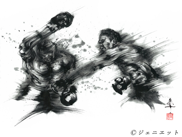 「“躍動”をテーマに描いているので、ボクシングの試合を描いた作品『BOXING』のように動いている人の一瞬を墨絵で表現したいと思っています。」
