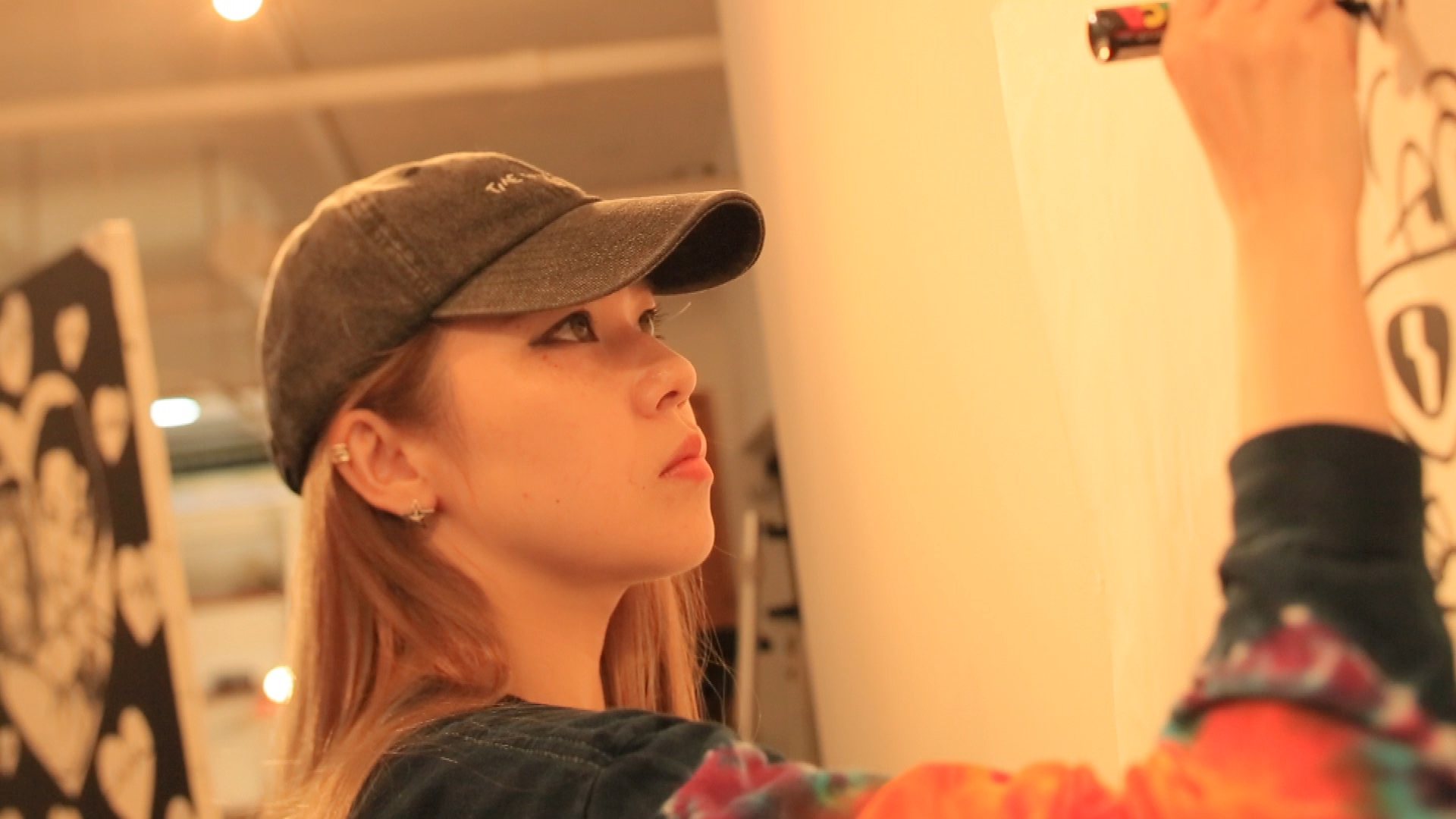 大きな白いキャンバスを埋め尽くす、無数のポップなキャラクター。描いたのは、chocomoo。