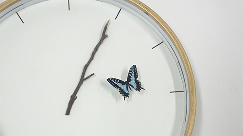 短針が蝶、長針が木の枝になっている時計。針が重なると…蝶が枝にとまっているように見える。生み出したのは、スタジオスルメ。メンバーは菊池 光義と増田 佑佳の二人、デザイン競技会で受賞するなど、いま注目のデザインユニット。