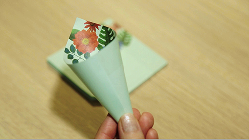 「ポケットサイズに折りたたむと16種類の柄が楽しめるハンカチです。その日の気分や服装に合わせて柄が選べるので長く使ってもらえると思いますね。」