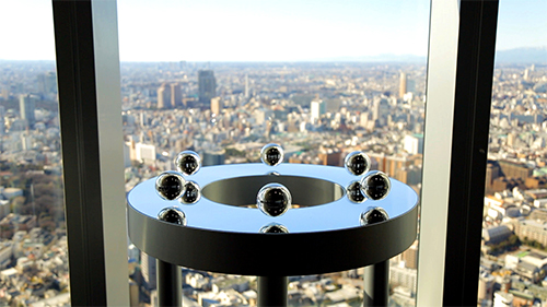 テーブルの上を浮遊する鉄の球。これは、磁石の反発を利用したアート作品。