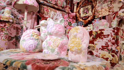 花柄の毛布で様々な物をくるんで作品を制作するアーティスト。