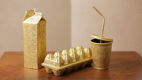 金色に輝く牛乳パック…実は、木彫りの彫刻作品。