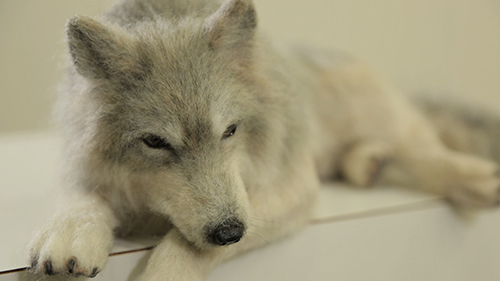 灰色の毛並が美しい狼。実は、セーターやマフラーに使われる“羊毛”で作られている。