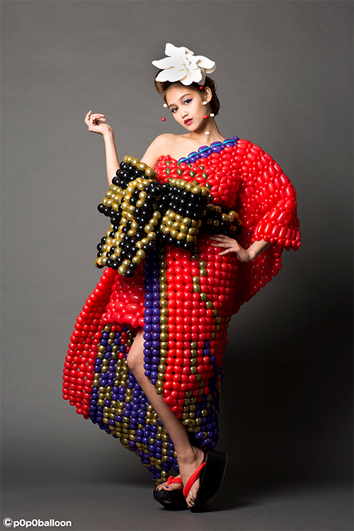 風船だけで作られた衣装「Modern kimono~花魁~」。帯の深みのある金色部分はどうやって生み出したのか?