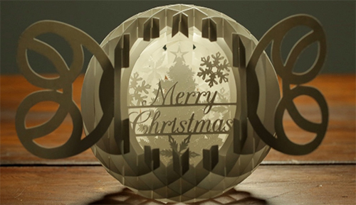 コースターのように見える丸い紙。手のひらに乗せ、軽く握ると…一瞬で球体に。さらに、球体の中をのぞくと“Merry Christmas”のメッセージが。実はこれ『球体ポップアップカード』というオリジナルのメッセージカード。作ったのは、月本せいじ。