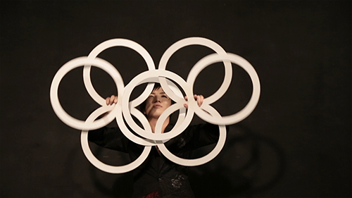 暗闇を浮遊する4つの円。実はこれ、40センチほどのリングを曲に合わせて人が動かすパフォーマンス。演じるのは、世界中から出演依頼が殺到するというパフォーマー、謳歌。リングの回し方にも工夫がある。