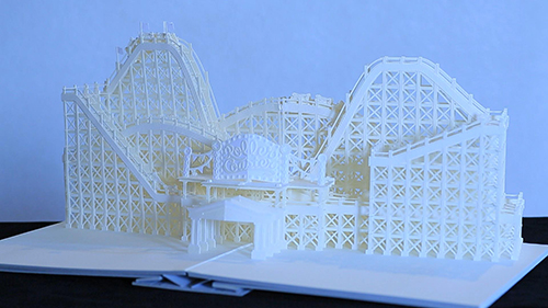 「小さい頃に“飛び出すカード”に出会いまして、平面であるカードを開くと立体が飛び出すというところにすごく衝撃を受けたんです。私の作品で最も重要視しているのはリアリティーです。例えばローラーコースターの作品だったら、世界中の木造ローラーコースターがどういう構造で組み立てられているのかを研究して制作しています。」