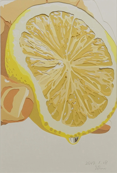 「紙を重ねて切り抜くだけで立体的な表現が出来るのがすごくおもしろいなと思ったので、この方法で制作しています。食べることが大好きなので、食べ物をモチーフにすることが多いです。」
