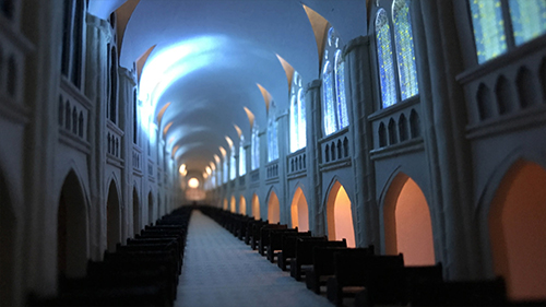 「フランスのステンドグラスがある建物を表現しました。ステンドグラスは一枚一枚、細かく絵柄を入れて作っています。」