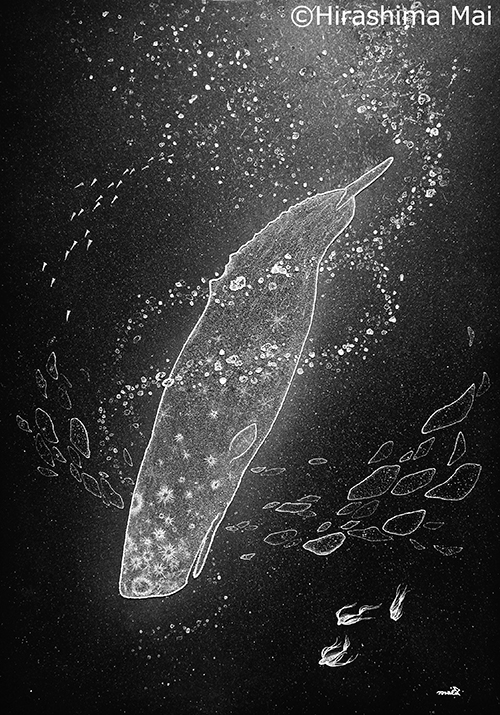 暗闇を泳ぐ一頭のクジラを描いた作品。完成した時は、クジラの周囲にプランクトンも描いていたが、1年半の間に消えてしまったという。