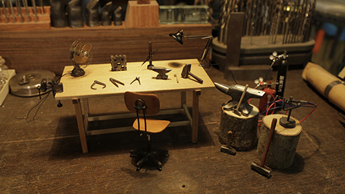 工具が散らかっている作業デスク。実は、工具もデスクも全て、実物の12分の1サイズのミニチュア。生み出したのは、金属造形作家 小宮貴裕。制作する上で、こだわっていることがある。