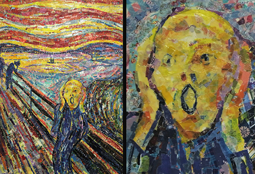 世界的名画 ムンクの「叫び」。よく見ると、絵の表面に花や水玉などのカラフルな模様が描かれている。実は、使っているのは絵の具ではなく、マスキングテープ。