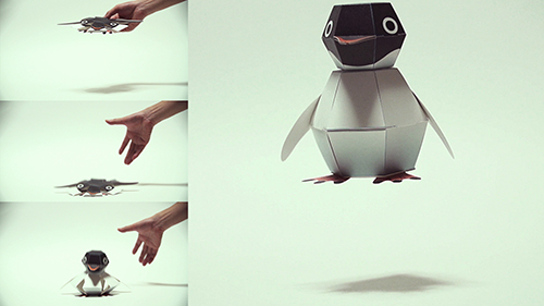不思議な形をした平面状の作品は、手を離すと…落下して着地と同時に飛び上がり、一瞬で立体的なペンギンになる。この仕掛けも、偶然生まれたという。