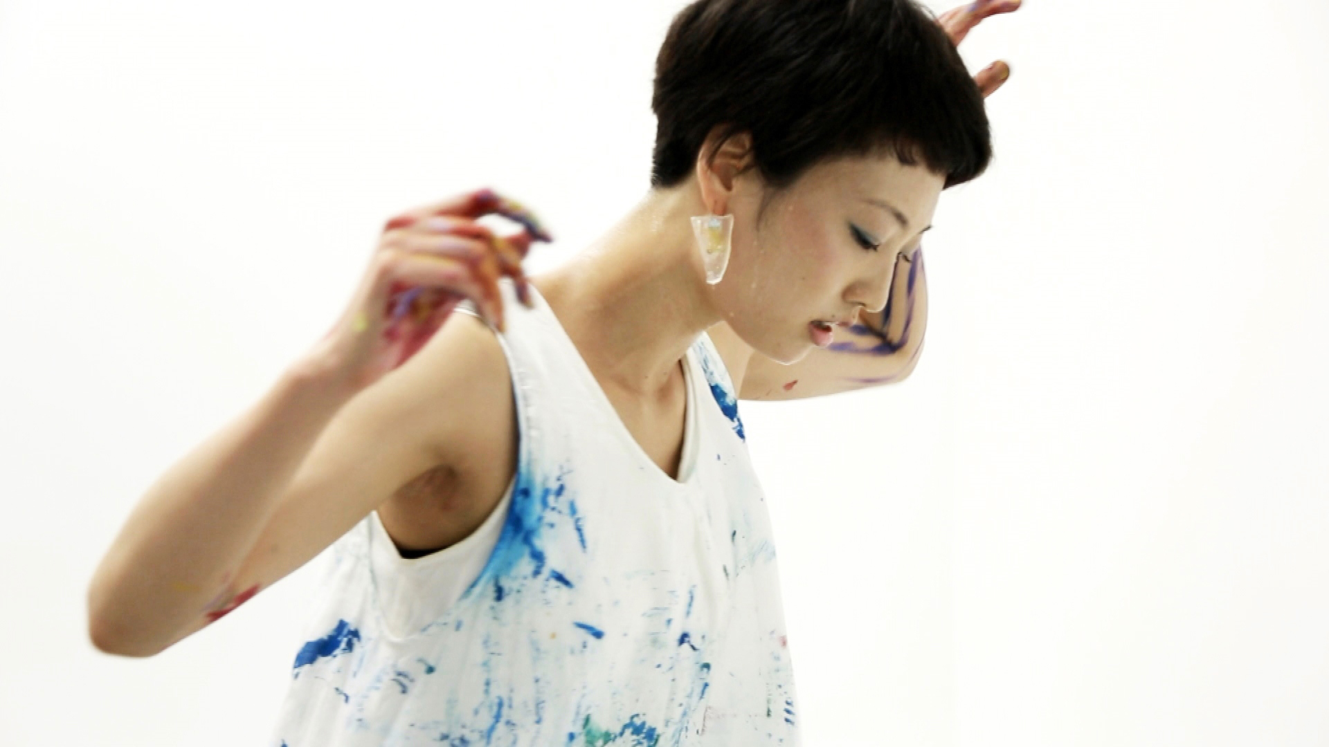 「ある日、もうバレエはやめようと思って、トゥシューズも処分しようと思いました。でも、このまま処分してしまうのはもったいないと思って、最後に絵の具をつけて遊んでみようと思ったのがきっかけです。 足で描くことはとても難しい。でも、描きにくさが面白いところでもあります。」