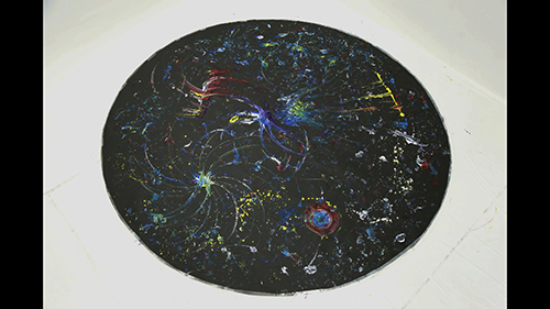 「一つ一つの銀河は意図して描いていますが、その周りの線はキャンバスの上を移動する時の足跡です。作品が出来上がってみると、その足跡がエネルギーや星に見えたりして、作品を引き立たせていると思います。」