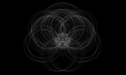 496もの円が重なり合い、幻想的な紋曼荼羅は、葉脈が整然と並ぶ、「若松の紋」を描く時の軌跡を利用した作品。