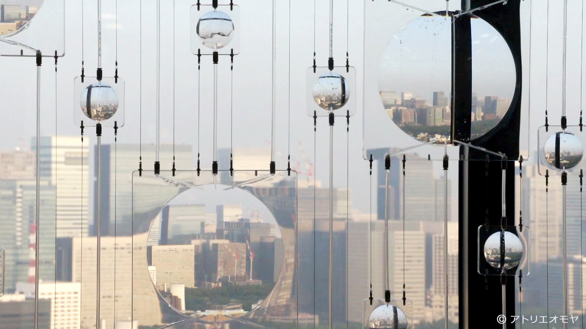 高層ビルの一室で窓に設置されたアクリル製のオブジェ。円形の容器に水が入ると、外の景色が拡大されて見える。