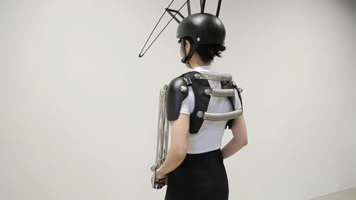 「両肩をバネで引っ張り、猫背が解消できるように作りました。背筋がシャキッと伸びた姿の方が美しいと思っています。」