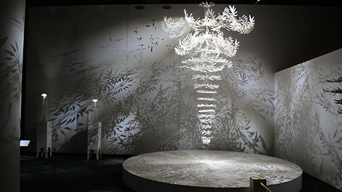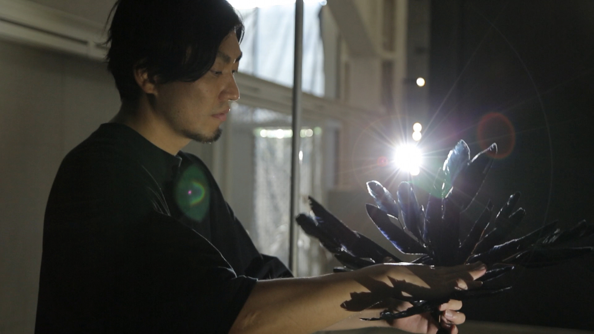 「置いていた羽が、たまたまエアコンの風で動いたので、こんなに少しの風でも動くのは面白いなと思いシャンデリアにしてみました。 作ってみると、たくさんの影が出てくることを発見して、すごくラッキーでしたね。」