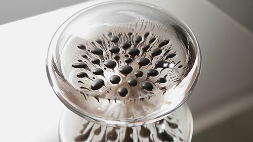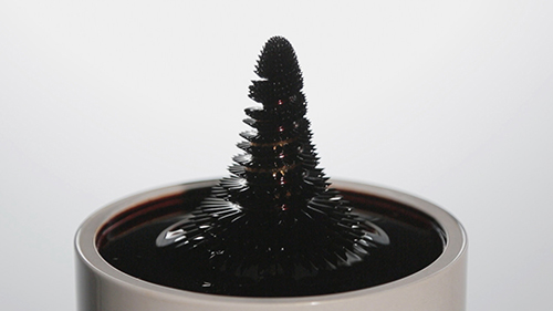 磁力に反応して形を変える特殊な黒い液体に下から磁力を送り、液体の形をコントロールしている。