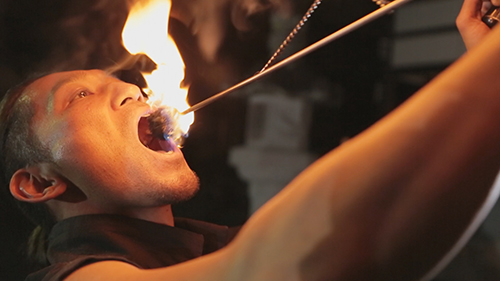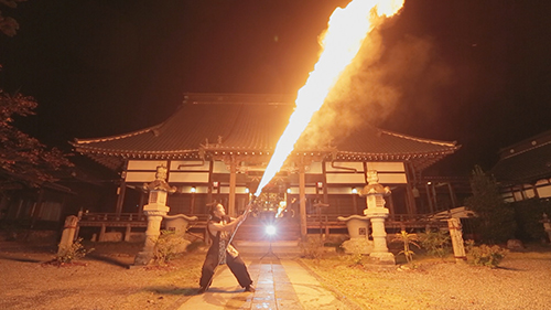 「火をただ回しているだけだと、飽きられてすぐどこかに行かれてしまうので、火炎放射器みたいな世界中の道具を混ぜてやっています。」