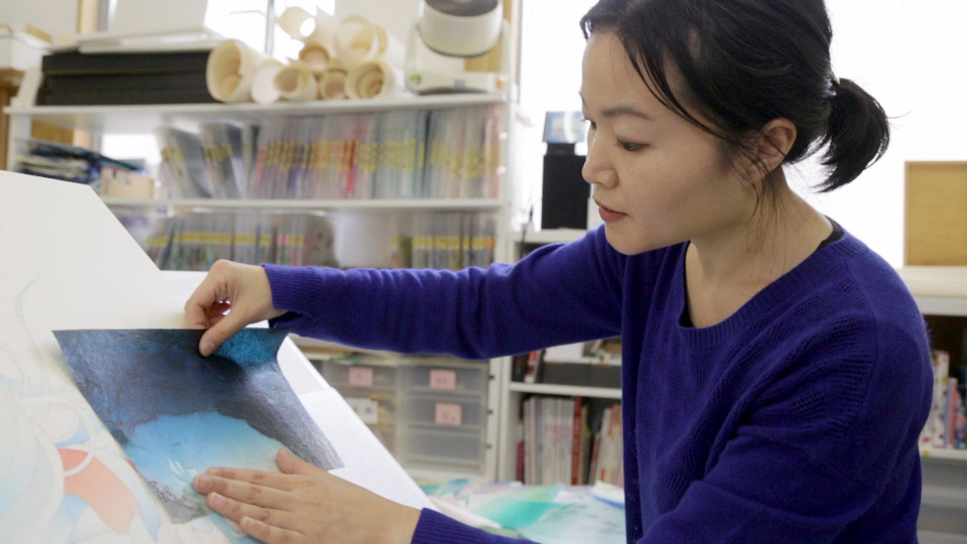 「それまで自分で作ってきた版画を貯めていたのですが、それを捨ててしまうのももったいないので綺麗なところだけ切り取って、切ったり貼ったりすることを始めました。独特な質感とか、スーッと流れるようなグラデーションとか、版画でしか出せないものだと思います。」