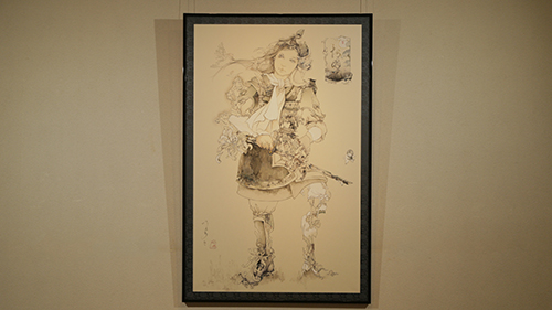 傘をモチーフにした版画は、少女が抱える鳥の羽根に。