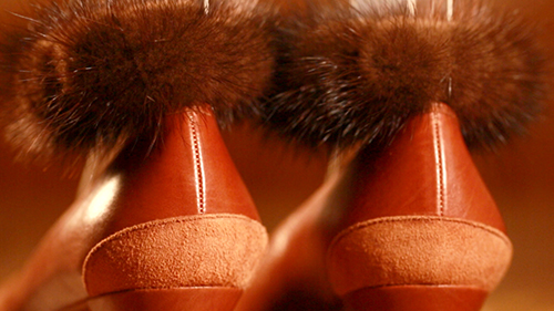 女性が履いている毛付きの牛革のパンプス。靴を脱ぐと鮮やかな緑色が…実はこのパンプス、果物のキウイがモチーフになっている。