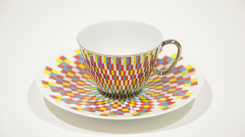 カラフルな模様のカップとソーサー。実は…カップ自体に模様はなく、ソーサーの模様が鏡面仕上げのカップの表面に写ることで模様の揃ったセットに見える。