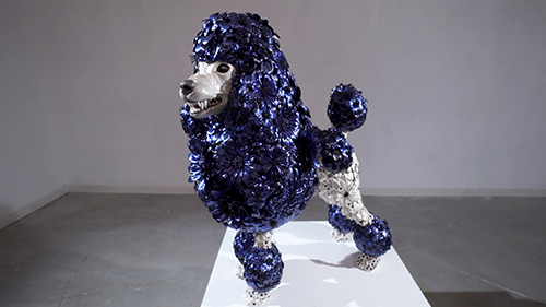 青や白の花で埋め尽くされた作品。離れて見ると、花々はプードルを形作っている。
