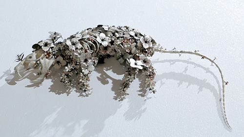 白い花々で作られた作品のモチーフは、なんと“ネズミの死骸”。