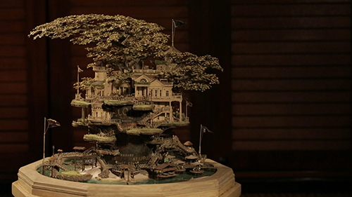 鉢から伸びた植物、その中に佇む城。一見盆栽のように見える作品だが、実は全てが精巧に作りこまれたミニチュア作品。デザインしたのは、相羽髙德。