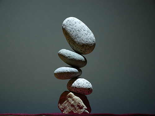 きわどいバランスで積み上げるコツは、目で見るのではなく、石の感触を手のひらで感じること。