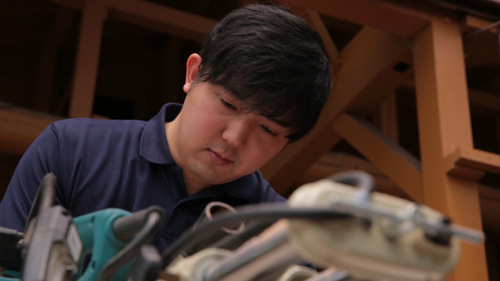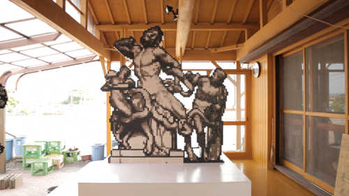 元の画像の、画質を荒くし、四角い点の集合体にする。それを3Dソフトで立体化した設計図をもとに、色の違う角材を積み上げていく。古代の名作をアレンジした独創的な彫刻。そこに込められたデザイン・コードとは…。