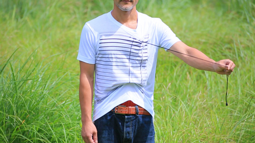 ブラインドの柄がプリントされたTシャツ。胸から垂れた紐を引っ張るとTシャツのすそが引き上げられ、まるでブラインドが引き上げられているによう見える。生み出したのは、デザイナー・能登大次(のとひろつぐ)、能登美代(のとみよ)の二人。能登夫妻。