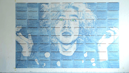 壁一面に大きく貼られた一枚の絵…そこには両手を広げ失意の表情を浮かべる男性が描かれている。その絵に近づいてみると…すべてハンコで描かれている。