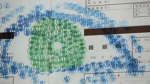 「この作品は72枚もの婚姻届けに、『希望』と『絶望』というオリジナルのハンコを押して、自画像を描きました。結婚に対して僕はすごく希望を持っているんですけど、既婚者から話を聞くとネガティブな話が多いんです。だからそれを聞いて僕が、絶望しながらも少しだけ希望を持っている様子を表現しています。」
