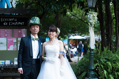 愛を誓う2人のウェディング写真。身につけた蝶ネクタイや帽子、髪飾りは全て植物でできている。生み出したのは、植物アーティスト スズキアキコ。スズキが植物でアクセサリーを作るきっかけとは…。