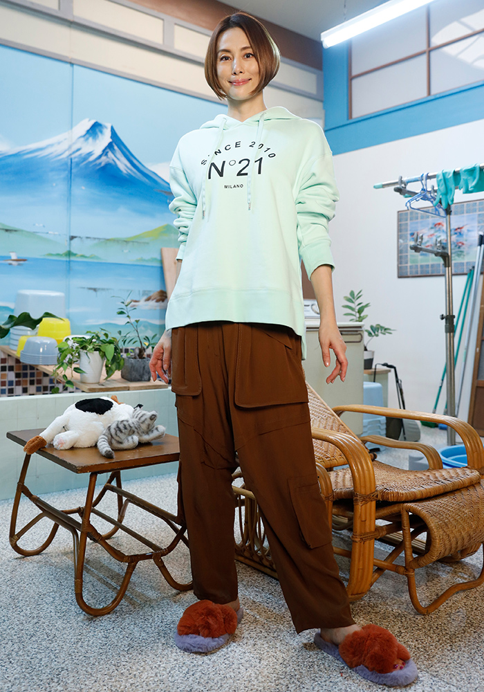いつも子供みたいに騒いでる"ひろみちこ"の焼肉シーンには、遊び心あふれるKIDSロゴの【MAISON SPECIAL (メゾン スペシャル)】のニットを。このブルーきれいですよね。袖のゆったり感もいいです。