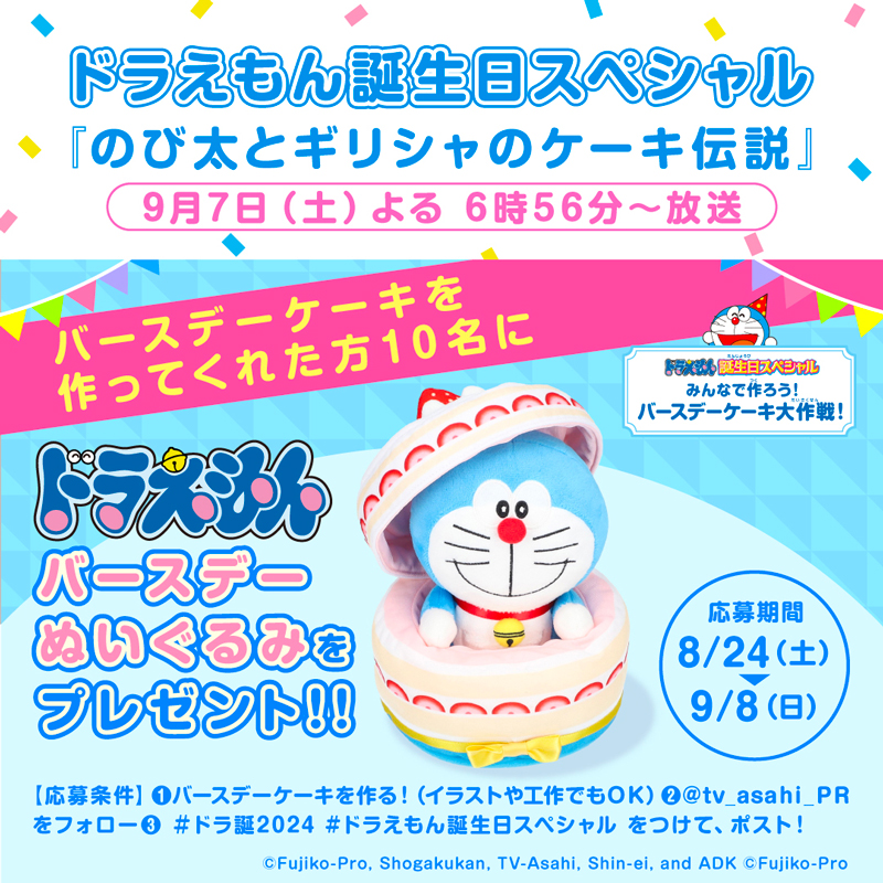 「テレビ朝日宣伝部」公式Xアカウント(@tv_asahi_PR)をフォロー。ドラえもんへ作ったバースデーケーキの写真や、イラスト、工作などで表現いただいたバースデーケーキの写真を「#ドラ誕2024」「#ドラえもん誕生日スペシャル」の2つのハッシュタグをつけてXで投稿いただいた方の中から抽選で10名様に、「ドラえもん バースデーぬいぐるみ」をプレゼント。