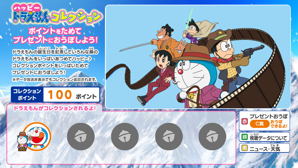 ただし、コレクションできるタイミングに別の番組を視聴していたり、テレビの電源を落としていると、そのドラえもん・ポイントを獲得することができないこともありますのでご注意ください。