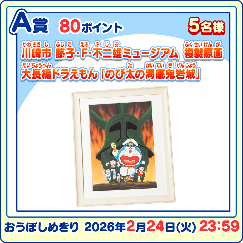 ※ほごしゃのかたによんでもらってね本規約は、株式会社テレビ朝日(以下「テレビ朝日」といいます)が、「映画「新・のび太の海底鬼岩城」公開直前!!「映画ドラえもんのび太の絵世界物語」」(以下「本番組」といいます)に関して実施する「QuizKnock・東兄弟からの挑戦状 海底鬼岩城クイズ」(以下「本企画」といいます)でのプレゼント応募に関する事項を定めるものです。