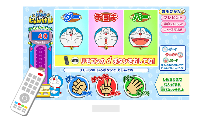 ドラえもんに勝つと10ポイント!あいこだと5ポイント!負けても「さんかポイント」として2ポイントゲット!
