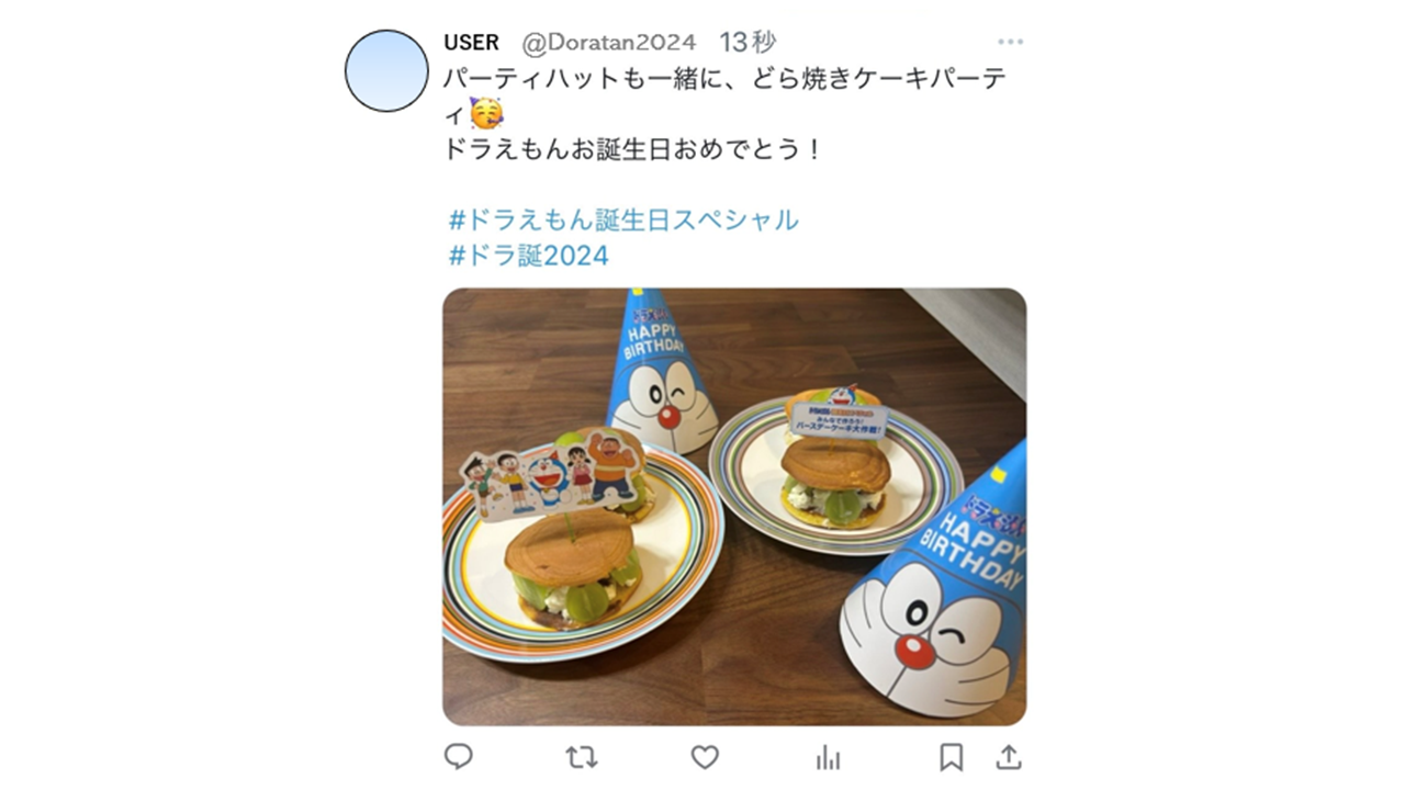 バースデーケーキを作って、X(旧Twitter)にケーキの写真を投稿(とうこう)し、ドラえもんをお祝いすると、投稿してくれた方の中から抽選(ちゅうせん)で10名様にドラえもんバースデーぬいぐるみをプレゼントするよ!