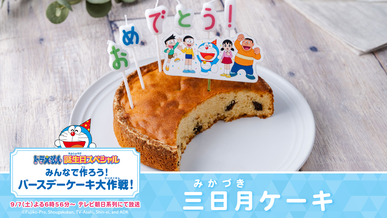 今日の『ドラえもんの誕生(たんじょう)日スペシャル』は楽しんでくれたかな? ドラえもんの誕生日をケーキでお祝いする「バースデーケーキ大作戦」のレシピに、今日のおはなし『のび太とギリシャのケーキ伝説』にも登場した古代ギリシャのバースデーケーキをイメージした“三日月ケーキ”のレシピが追加されました! ぜひみんなで作ってみてね。