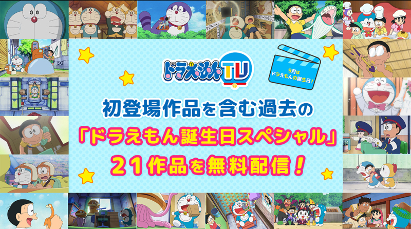 ドラえもんのアニメ視聴(しちょう)サービス『ドラえもんTV(ティーヴィー)』では、ドラえもんの誕生(たんじょう)日を記念して、過去の誕生日スペシャルの一挙(いっきょ)無料配信が決定!