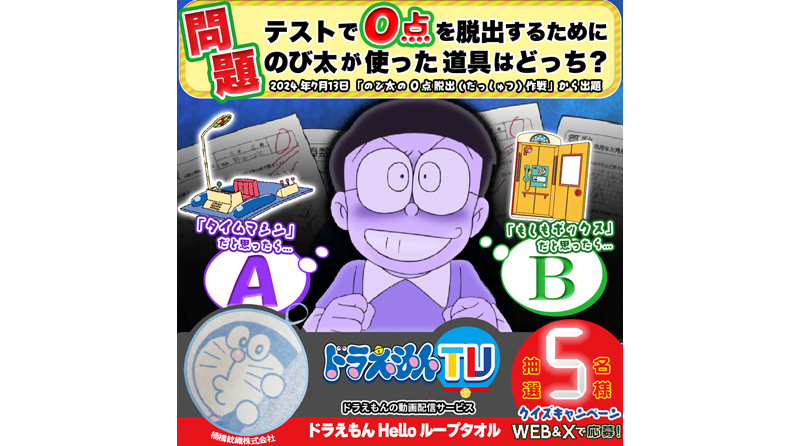 今月の問題は、「のび太の0点脱出(だっしゅつ)作戦」(2024年7月13日放送)というおはなしからクイズを出題(しゅつだい)しているよ。