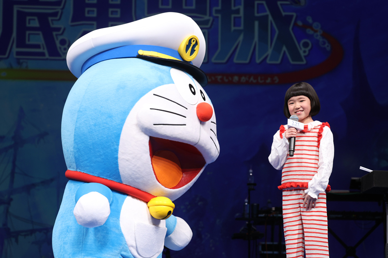 映画上映後、まずは海底をイメージしたステージでsumikaのみなさんが主題歌「Honto」の生歌唱! その圧巻(あっかん)のステージに客席は大もり上がり。歌い終わった片岡さんは、「待っている間、緊張(きんちょう)しすぎて心臓(しんぞう)が口から飛び出そうでした…。ぶじに歌えてよかったです!」と安堵(あんど)の表情に。続いて、MCから主題歌に決まった時の感想を聞かれた片岡さんが、「シャレに思われそうですが、“本当?”と思いました(笑)」と答えると、客席からも大きな笑い声が! 「それぐらい信じられないほどうれしかったんです」という片岡さんに続き、荒井さんからは「こんなに幸せなことはないなと思いました」、小川さんからも「本当に幸せです」とよろこびのコメントが続き、それを聞いたドラえもんは、「泣いちゃダメ…笑顔で!」と大感動。
